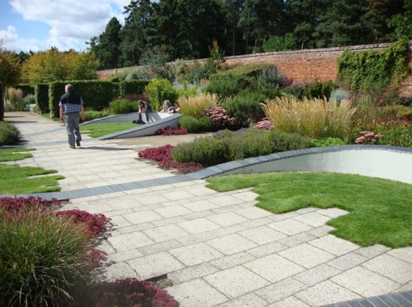 (2)鋪裝材料及鋪砌方式要統一,不宜變化太多。道路鋪裝要整齊、簡潔。一條園路用同一種形式的鋪裝較好,同一條園路上不宜進行太多的鋪裝變化,要服從整體的空間需要。一個空間中所用的鋪裝材料及拼砌圖案也不要過多,材料的過多變化或者過于繁瑣復雜的拼砌圖案容易造成雜亂無章的感覺。