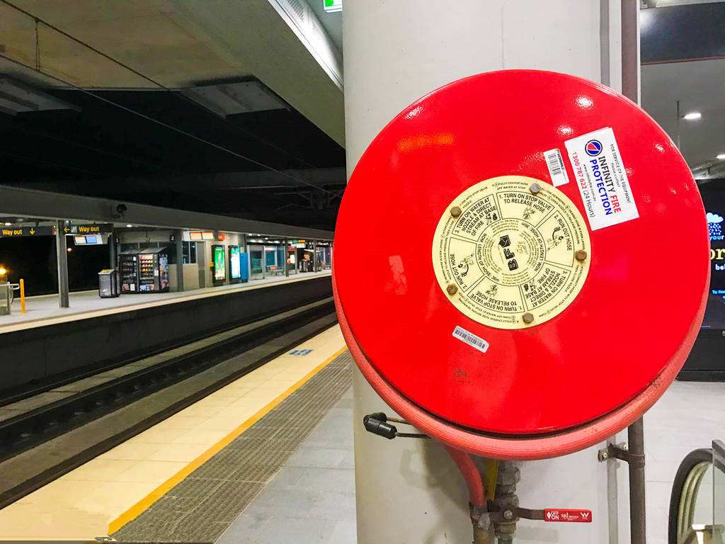 站臺(tái)要做消火栓,相當(dāng)于室外消火栓,并且要放置滅火器。現(xiàn)在有些站的站臺(tái)會(huì)用推車(chē)式的細(xì)水霧裝置代替滅火器。