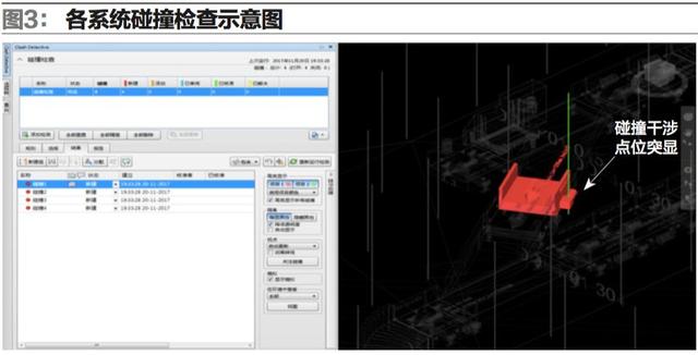 5.參照后的項(xiàng)目文件參照完成后可在項(xiàng)目中進(jìn)行各系統(tǒng)模型的碰撞檢查(如圖3),預(yù)先檢查出各干涉點(diǎn)位,把問(wèn)題解決在設(shè)計(jì)的初級(jí)階段,減少后期的返工和整改,從而保證項(xiàng)目設(shè)計(jì)質(zhì)量,減少整個(gè)項(xiàng)目的運(yùn)營(yíng)成本。