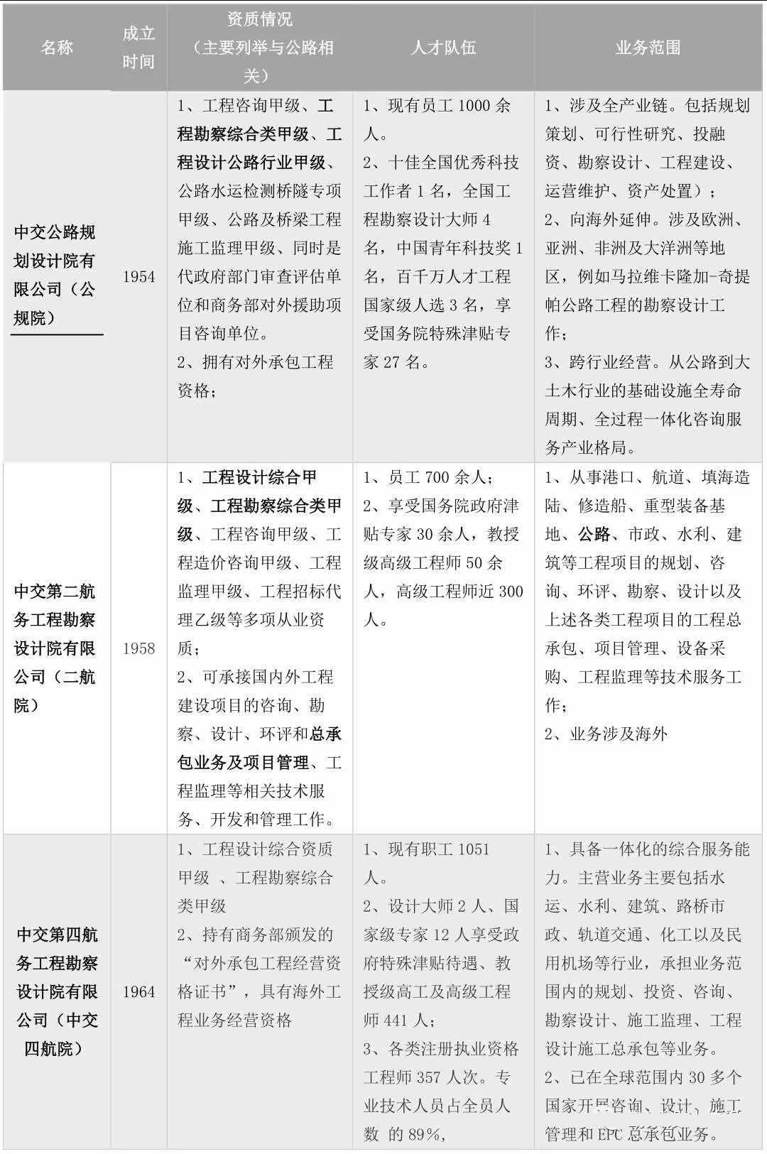表1:中交體系下與公路勘察設計相關的全資子公司基本情況