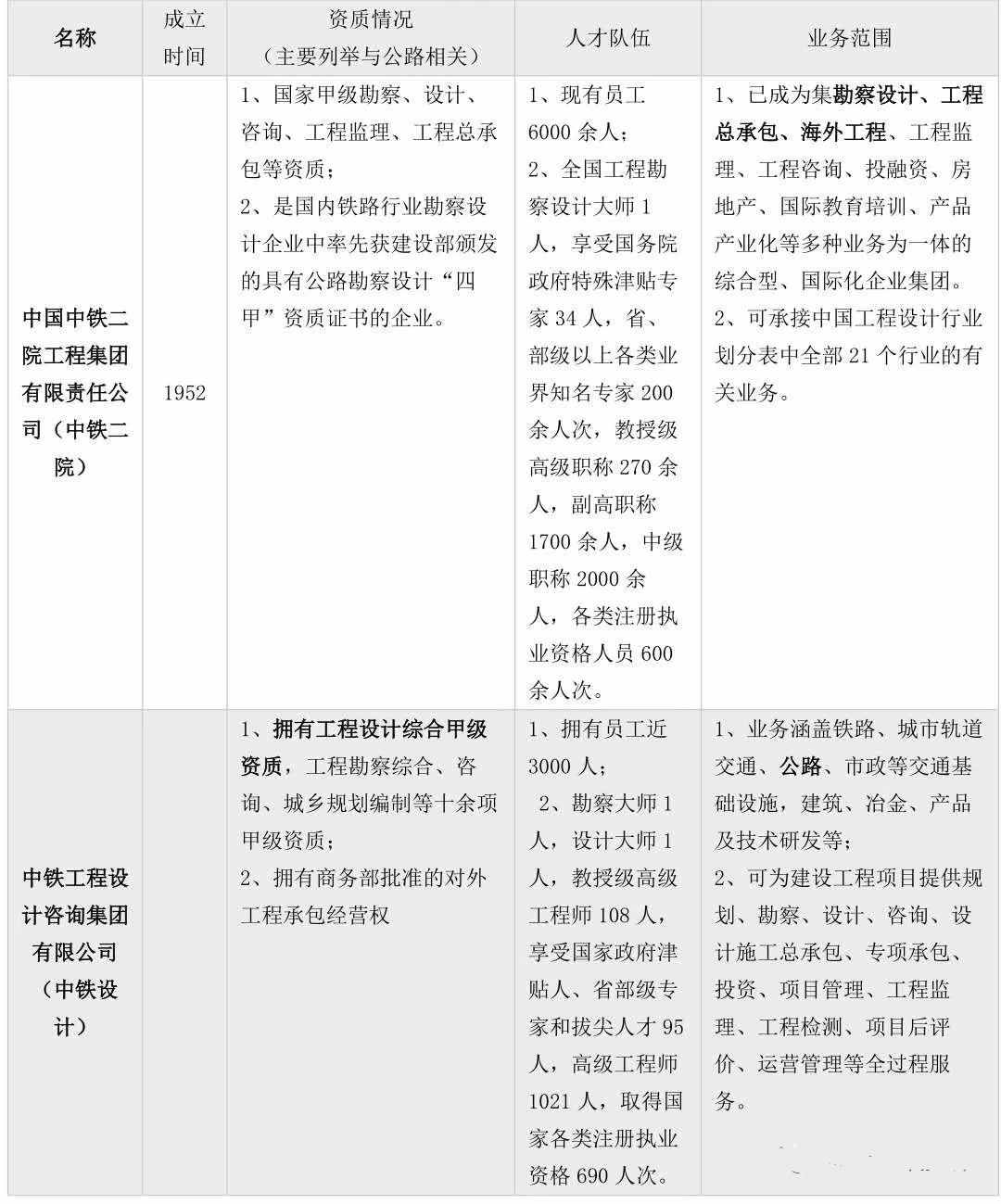 表2:中鐵體系下與公路勘察設計相關的全資子公司基本情況