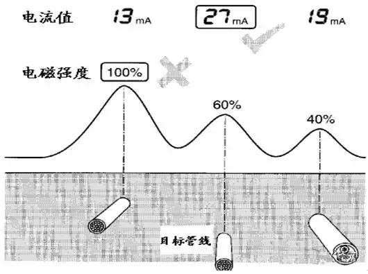 當用直接法工作時,被施加信號的目標管線上電流最大,而其它并行管線電流為感應電流,電流值較小,通過測量出電流值大小方法區分出目標管線。(如圖)