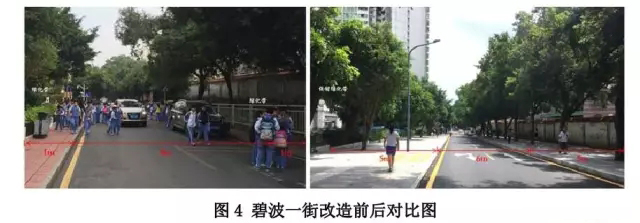 ● 碧波一街:原雙向2 車道機動車道寬度從8 米壓縮為6 米,利用兩側(cè)消極的綠化帶,將兩側(cè)人行道寬度從1 米加寬到5 米。