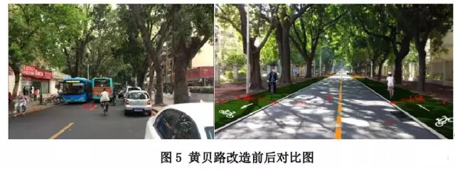 ● 黃貝路:原10 米機動車道壓縮為7 米,在兩側(cè)各設(shè)置1.5 米寬自行車道,解決自行車出行和地鐵接駁需要。