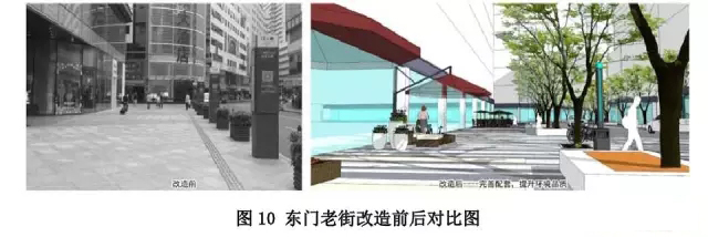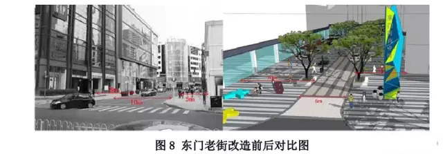 ● 東門老街:機動車道由10 米壓縮至6 米,兩側(cè)人行道分別從5 米加寬至7 米,從8米加寬至10米。