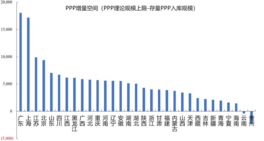 我們基于地方財政基礎測算PPP潛在空間。從整體來看,估算的大多數省份PPP項目潛在總增量均為正值,但區域數據差異較大。東部沿海發達省份PPP項目潛在增量規模最大,而中西部省份相對較小。