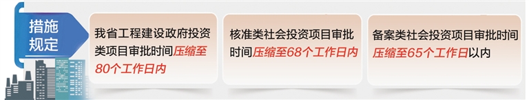 根據《若干措施》規定,河北省工程建設政府投資類項目審批時間壓縮至80個工作日內,核準類社會投資項目審批時間壓縮至68個工作日內,備案類社會投資項目審批時間壓縮至65個工作日以內。