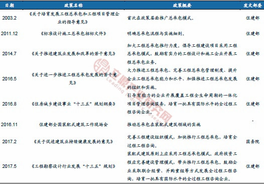 ——自2003年開始,國家陸續(xù)出臺政策推廣總承包模式,并引導裝配式建筑原則上使用總承包模式。2016年住建部發(fā)布《關于進一步推進工程總承包發(fā)展的若干意見》,《意見》強調大力推進工程總承包,提升項目可行性研究和初步設計深度,實現(xiàn)設計、采購、施工等各階段工作的深度融合,提高工程建設水平。