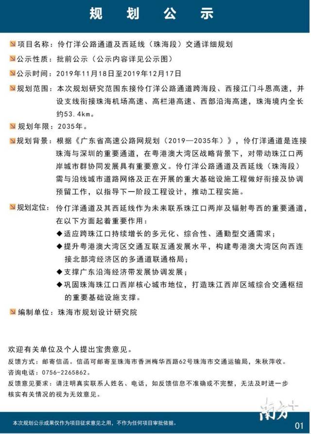 18日,珠海市交通運輸局官網(wǎng)公布關于《伶仃洋公路通道及西延線(珠海段)交通詳細規(guī)劃》(下稱《規(guī)劃》)公開征求意見的公告,向社會征求意見意見和建議。