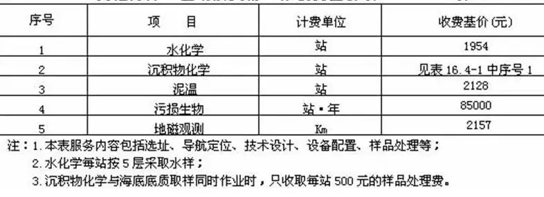 在《工程勘察收費(fèi)標(biāo)準(zhǔn)》里,除了看2.3節(jié)里的“水域測量”部分外,還需要關(guān)注第16部分的“海洋工程勘察”部分,該部分對多波束海底地形測量,海底面狀況掃側(cè),底質(zhì)取樣,氣象、潮位、波浪觀測,海流、鹽度、泥沙觀測,海洋工程地質(zhì)鉆探,海底地層測量,及其他海洋工程勘察項(xiàng)目,等等都作出了勘察收費(fèi)依據(jù)。這里,海底面狀況掃側(cè)是指掃海測量,海底地層測量可以對應(yīng)淺地層剖面測量。而海底地層測量又細(xì)分聲學(xué)地層探測、單道地震探測及多道地質(zhì)探測三類。在其他海洋工程勘察項(xiàng)目部分中,地磁觀測可以與海洋磁力測量對應(yīng),另外還包括沉積物化學(xué)、污損生物、水化學(xué)等內(nèi)容。