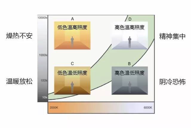 人對色溫的喜好還與照度水平有相應的關系,不同的色溫及照度組合,會通過人的視覺令人產生不同的精神狀態(tài)及心理感受,所以色溫及照度組合的正確選擇是決定整個環(huán)境舒適度的基礎。下圖給出了不同照度水平下不 同色溫所產生的不同印象: