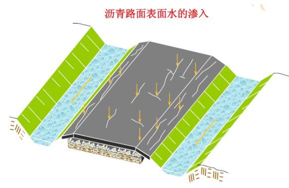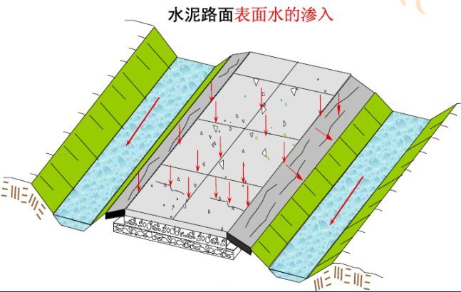 路面結(jié)構(gòu)內(nèi)部水的危害:浸濕各結(jié)構(gòu)層材料和路基土,易造成無粘結(jié)粒狀材料和地基土的強度降低;使水泥混凝土路面產(chǎn)生唧泥,隨之出現(xiàn)錯臺、開裂和整個路肩破壞;進入空隙的自由水在行車荷載的作用下,會形成高孔隙水壓力和高流速的水流,引起路面基層的細(xì)顆粒產(chǎn)生唧泥,結(jié)果失去支承;在冰凍深度大于路面厚度的地方,高地下水位會造成凍脹,并在凍融期間降低承載能力;水使凍脹土產(chǎn)生不均勻凍脹;與水經(jīng)常接觸將使瀝青混合料剝落,影響瀝青混凝土耐久性和產(chǎn)生龜裂。