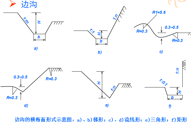 橫斷面:一般為梯形,溝的邊坡坡度,因巖土條件而定,一般采用1:1.0~1:1.5。溝底寬度b不小于0.5m,溝深h按設(shè)計流量而定,亦不應(yīng)小于0.5m。