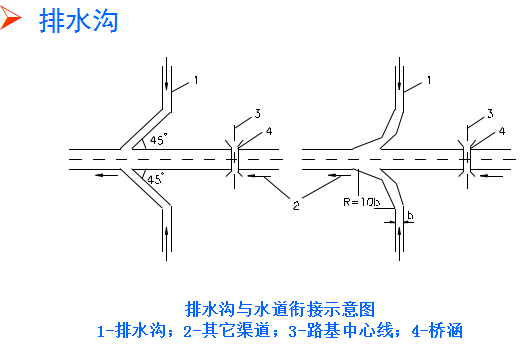 (3)排水溝水流注入其他溝渠或水道時,應(yīng)使原水道不產(chǎn)生沖刷或淤積。通常應(yīng)使排水溝與原水道兩者成銳角相交,交角不大于45?,有條件可用半徑R=10b(b為溝頂寬)的圓曲線朝下游與其它水道相接。