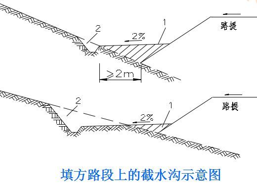 2.截水溝:又稱天溝,一般設(shè)置在挖方路基邊坡坡頂以外,或山坡路堤上方的適當(dāng)?shù)攸c,用以攔截并排除路基上方流向路基的地面徑流。