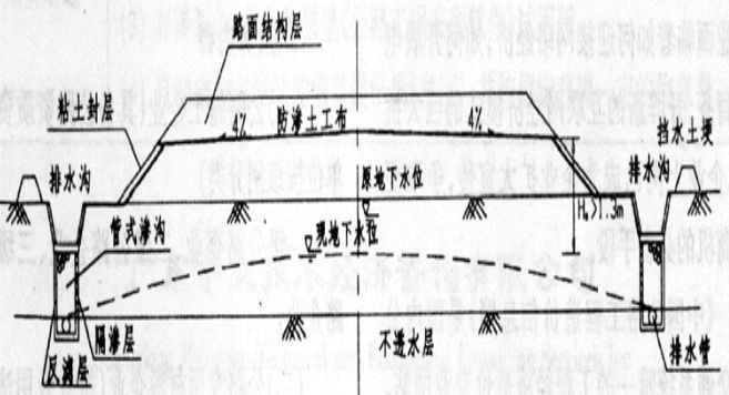 (1)路線高度與原地面相仿,排水困難,距地面有滲透性土層。