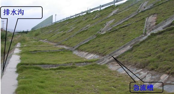 在路堤較高,邊坡坡面在未做防護而易遭受路面表面水流沖刷,或者坡面雖已采取防護措施但仍有可能受到?jīng)_刷時,應(yīng)沿路肩外側(cè)邊緣設(shè)置攔水帶,匯集路面表面水,然后通過泄水口和急流槽排離路堤。