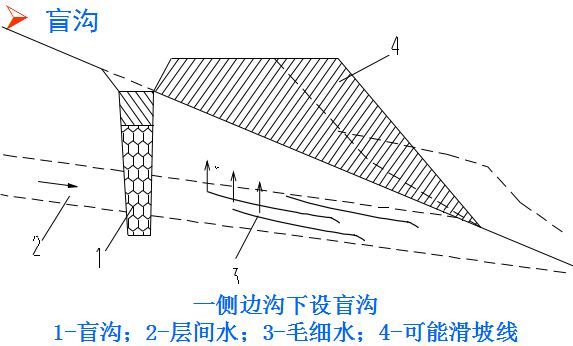 7.盲溝:相對于地面排水的明溝而言,盲溝又稱為暗溝,是一種隱蔽工程。在溝內(nèi)填以大小不同的顆粒材料,利用滲水材料的透水性將地下水匯集與溝內(nèi),并沿溝排泄至指定地點。
