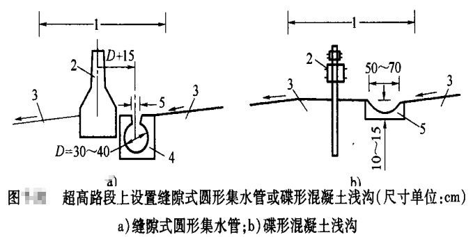 (1)寬度小于3m且表面采用鋪面封閉的中央分隔帶排水,降落在分隔帶上的表面水排向兩側(cè)行車道,其坡度與路面的橫坡度相同;在超高路段上,可在分隔帶上側(cè)邊緣處設(shè)置緣石或泄水口,或者在分隔帶內(nèi)設(shè)置縫隙式圓形集水管或碟形混凝土淺溝和泄水口,以攔截和排泄上側(cè)半幅路面的表面水。緣石過水?dāng)嗝娴男顾诳刹捎瞄_口式,格柵式或組合式;碟形混凝土淺溝的泄水口采用格柵式。