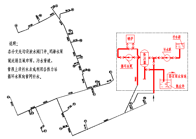 熱水網(wǎng)干線設分段閥門。輸送干線2~3km;輸配干線1~1.5km。