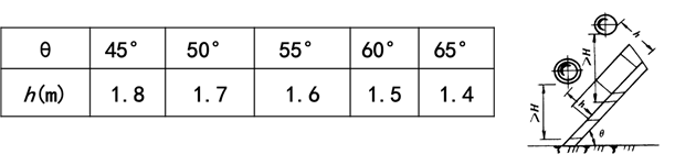 管道保溫表面與通道之間距離不小于2m。管道橫跨扶梯上空,保溫表面至扶梯傾斜面的垂直距離h,不小于表中數(shù)值。