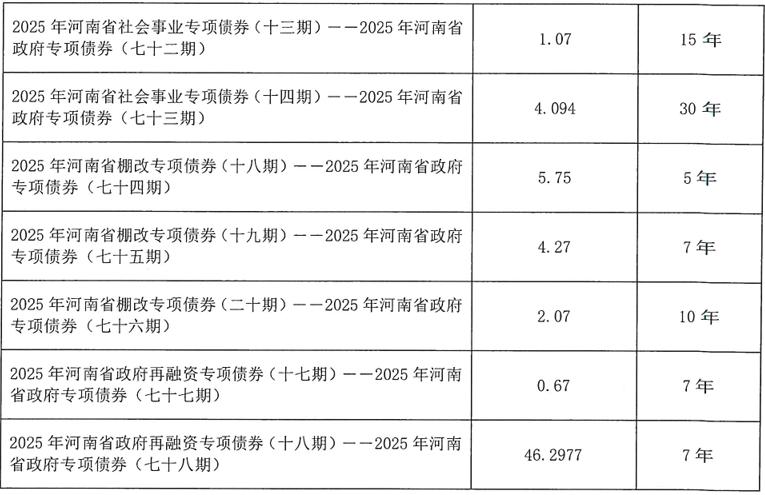 2025年河南省政府一般債券(十期)擬發行金額294.1451億元,用于償還2018年河南省政府一般債券(六期)、2020年河南省政府再融資一般債券(四期)-2020年河南省政府一般債券(七期)等債券本金。